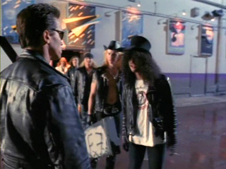 In 1994, a cyborg (Arnold Schwarzenegger) is sent back in time to protect John Connor (Edward Furlong), the future leader of humanity in a 21st century war against machines. A competing machine (Robert Patrick), the T-1000, is sent back to kill John. With the aid of John's mother Sarah (Linda Hamilton), the cyborg manages to destroy the T-1000 at a confrontation at a steel mill. However, the cyborg must then destroy itself in order to eliminate its chance of being used to help fuel the future war with the machines. Sarah helps the cyborg destroy itself, but not before the cyborg consoles John, quietly assuring him that everything will be okay. Sarah then notes that if a machine can learn the value of human life, perhaps people can, too. Production credits appear in shots of traffic lines and children playing in playgrounds. The shot starts to fade into blue as the sounds of children's voices die out, followed by a flash-forward to Los Angeles in 2029 AD. The world has become a wasteland of wrecked cars, destroyed buildings, and black-charred playgrounds filled with skeletons and skulls. The voice of Sarah Conner (Linda Hamilton) starts narrating: "3 billion human lives ended on August 29th, 1997. The survivors of the nuclear fire called the war Judgment Day. They only lived to face a new nightmare: the war against the machines." The foot of a metallic android smashes a skull on the ground. A battle is starting between human guerrilla troops and a technically far superior robotic army. Crushing skulls beneath their tracks, robotic tanks open a full-frontal assault on the humans, who are trained to make use of what shelter the ruined terrain offers them. Flying aircraft search the ground for targets, as T-800 androids sweep the terrain at places the tanks cannot access. Although they suffer heavy losses, the humans manage to destroy several tanks, aircraft and androids. They even use old cars as crude assault vehicles, but the machines lasers are accurate and unrelenting. A man is saluted by his soldiers as he crosses a destroyed hallway and starts to inspect the battlefield from a safe distance. The camera zooms in on his scarred face as Sarahs voice-over continues: "Skynet, the computer that controlled the machines, sent two terminators back through time; their mission: to destroy the leader of the human resistance: John Connor, my son. The first Terminator was programmed to strike at me in the year 1984, before John was born. It failed. The second was set to strike at John himself when he was just a child." The close-up of John Connor dissolves into a blaze of inferno, as Sarah continues: "As before, the Resistance was able to send a lone warrior as a protector for John. It was just a question of which one would reach him first." The opening credits start playing in a montage of shots of playground burning in an inferno. The credits end as the camera starts zooming into the metal face of a Terminator, through the fire, until its red glowing eyes are in extreme close-up. Flashback to present day. A truck starts its engine and drives away from a truck stop, where a wind suddenly starts to blow and electric charges fill the air. Out of nowhere, a brightly-lit orb appears, cutting out parts from the ground and a nearby truck. The orb dissolves, leaving a crouching, naked man in its place. As the electrical charges slowly fade, the man (Arnold Schwarzenegger) rises to his feet. It is a Terminator, same appearance as the one that got sent through time in The Terminator to kill Sarah Connor. We see its red point-of-view processing screen as it approaches a biker bar called The Corral and inspects the motorcycles in front of it, before it enters through the door. Inside, the pool-playing and drinking biker population watches with a mixture of astonishment and amusement as the completely naked man calmly walks in between them, inspecting every male costumer on the way. It stops in front of a cigar-smoking biker as it finds out that the mans clothes are a match to its body size. The Terminator calmly tells him that he needs his clothes, boots and motorcycle, to much hilarity of the other customers. The cigar man tells it that he forgot to say please and blows smoke in Terminators face. He then puts out his cigar on Terminators bare chest, only to find out to his amazement that it doesnt seem to feel the pain. Terminator forcefully grabs the mans hand and twists his arm. Another biker hits Terminator in the head with a pool cue, but he gets thrown out of the front window by the unaffected Terminator. The cigar biker is thrown into the kitchen on the hot stove, and when another biker trying to attack gets nailed to the pool table with his own knife, the rest of the customers decide to pull off their attack. Terminator enters the kitchen and quickly pulls away the gun the cigar biker pulled out, after which he throws Terminator his keys and tells it to take it. Terminator steps outside, fully dressed, and mounts one of the motorcycles, as the barkeeper comes out and fires a warning shot with his shotgun, threatening to kill him if he doesn't come off the bike. With a quick move, Terminator relieves him of his shotgun and sunglasses without hurting the man. He puts on the glasses and leaves on the bike. In a different part of town, a police officer calls in a strange electrical disturbance to Headquarters. As he inspects the area and notices a strange round hole burned into a fence, he is approached from behind by another naked man (Robert Patrick), more slender than Terminator, who instantly kills him with a quick jab in the gut. The man picks up the cops gun, enters the police car fully clothed, and accesses the cars computer to find the address of John Connor. At John Connor's house, his foster parents Todd (Xander Berkeley) and Janelle Voight (Jenette Goldstein) make several fruitless attempts to get John to clean up his room, but he just ignores and ridicules them and leaves on his bike with his